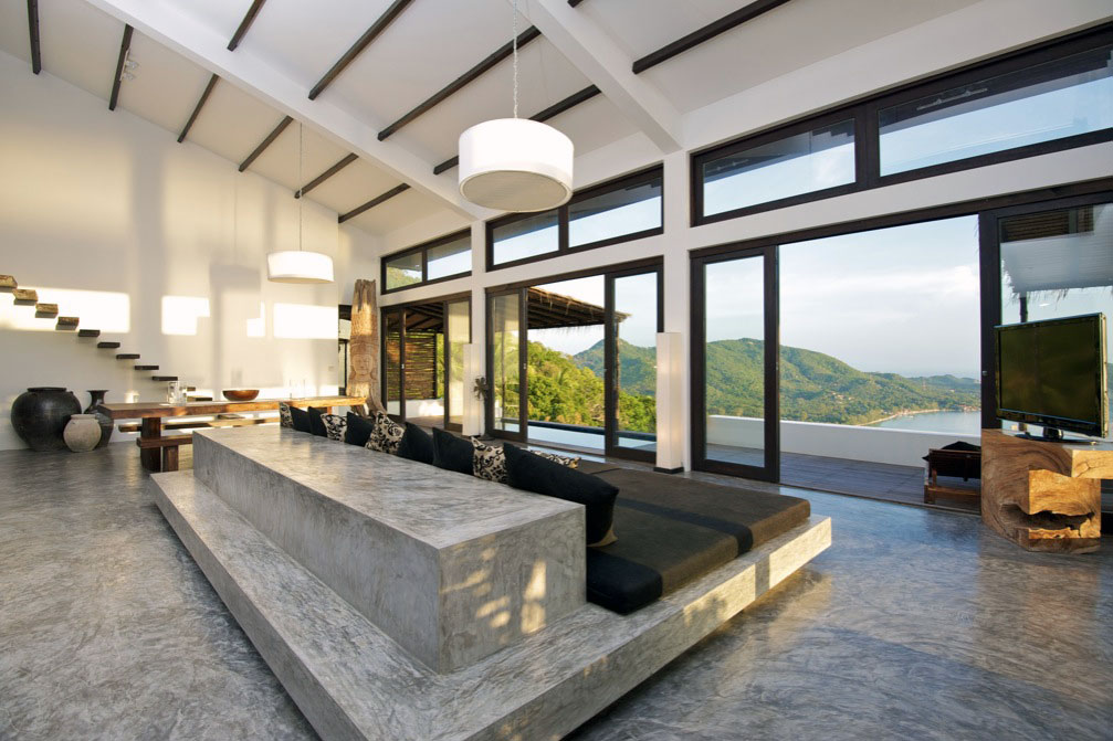 Gray Concrete Floor Living Room And Sliding Door Ideas - Interior